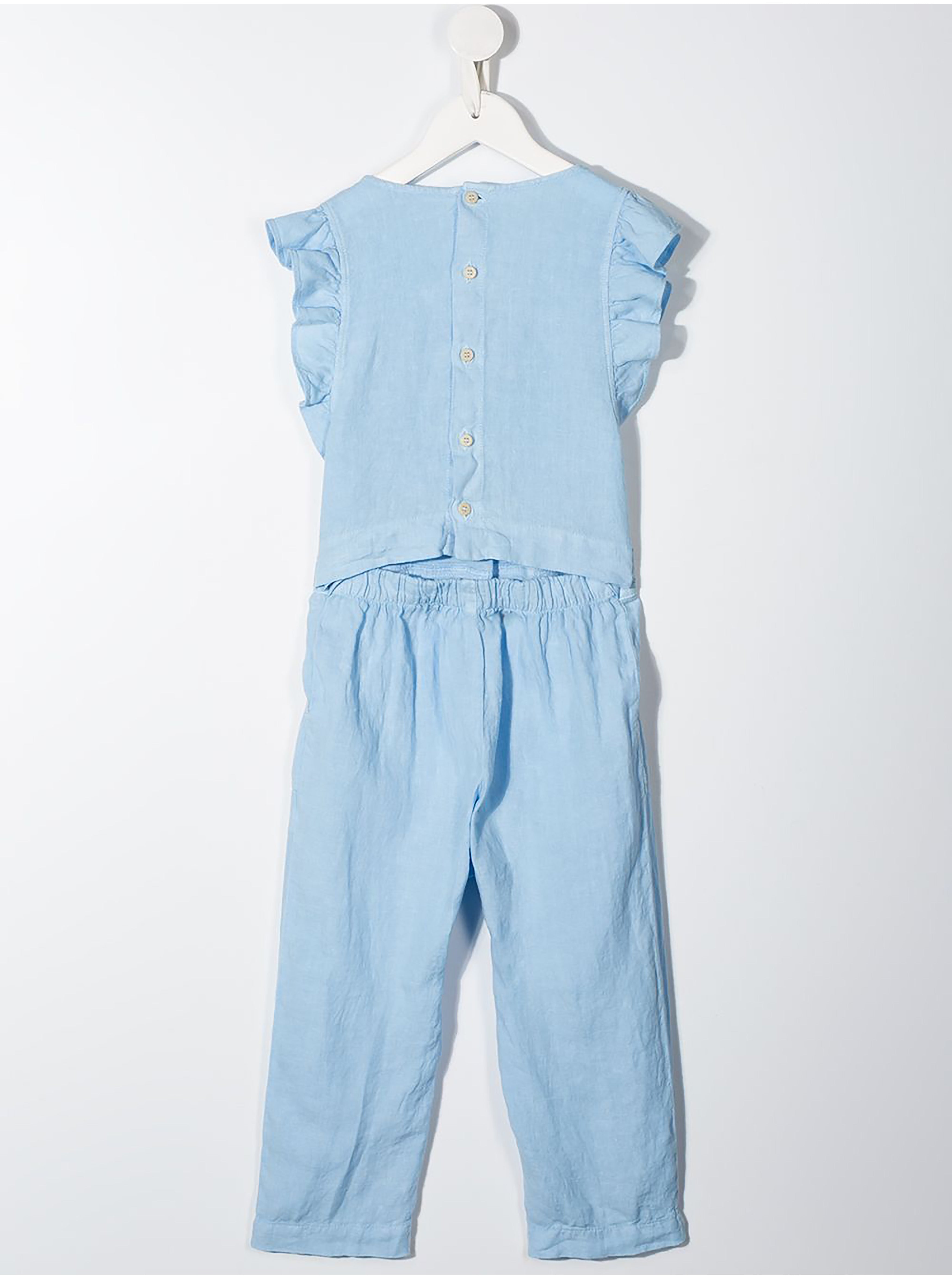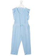 Light blue ruffle-trimmed linen jumpsuit from Il Gufo featuring a round neck, a back button fastening, short sleeves, an elasticated waistband with a drawstring fastening, a straight leg, side slit pockets and a regular length.