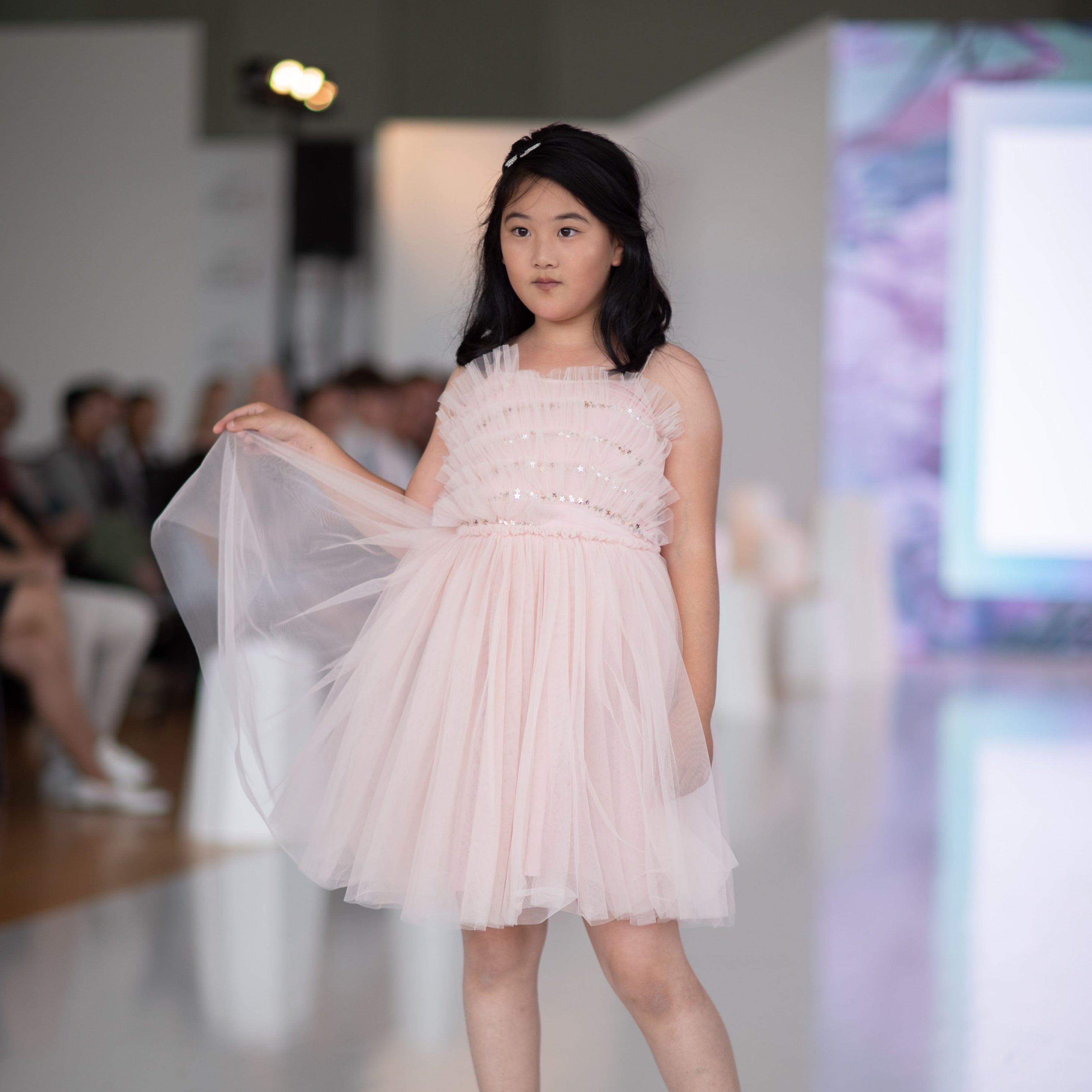 The dress boasts a layered tulle top that captures attention with its 3D-like texture, creating an illusion of depth and dimension. Each layer of tulle delicately overlaps the other, forming a tactile masterpiece that conjures the sensation of floating on air. This intricately arranged tulle top is a testament to the artisanal craftsmanship that defines Tutu du Mode.
