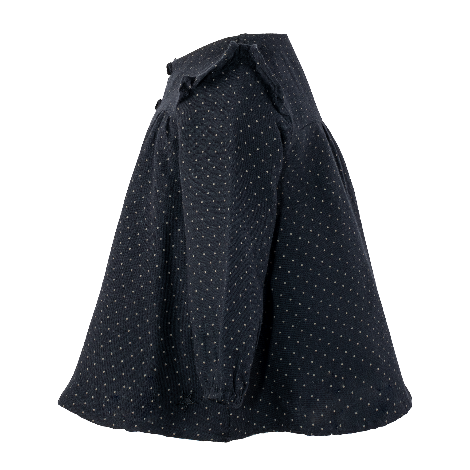 | Style | Enchanting mother of pearl buttons adorn the length of the dress, complimenting the frilled sleeves and elastic cuffs and an overall fit that is slightly loose. |