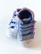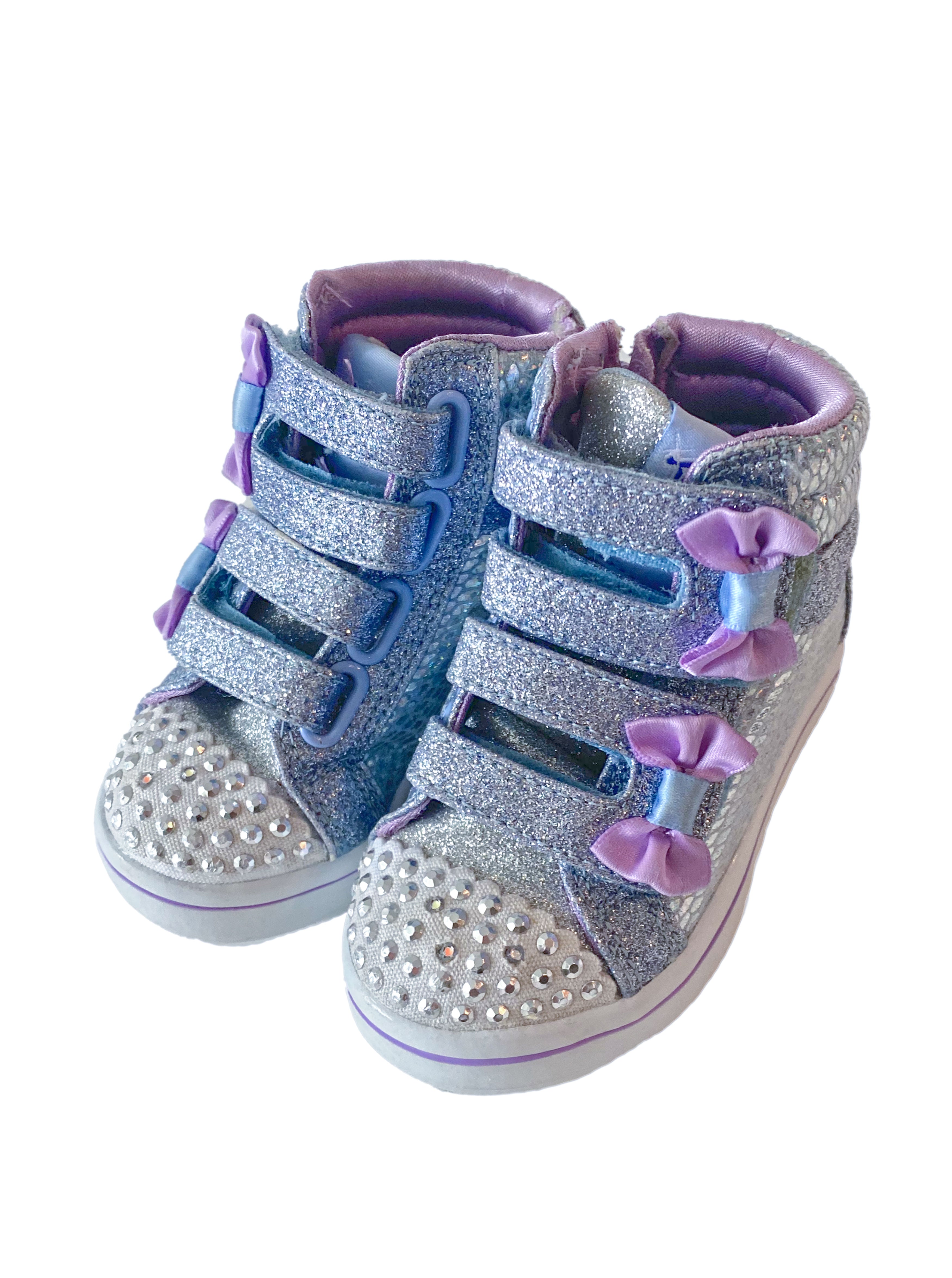 It glitters, it shines and it lights up! The Kids' Skechers Twinkle Toes Light Up Sneaker in silver and purple colour!
