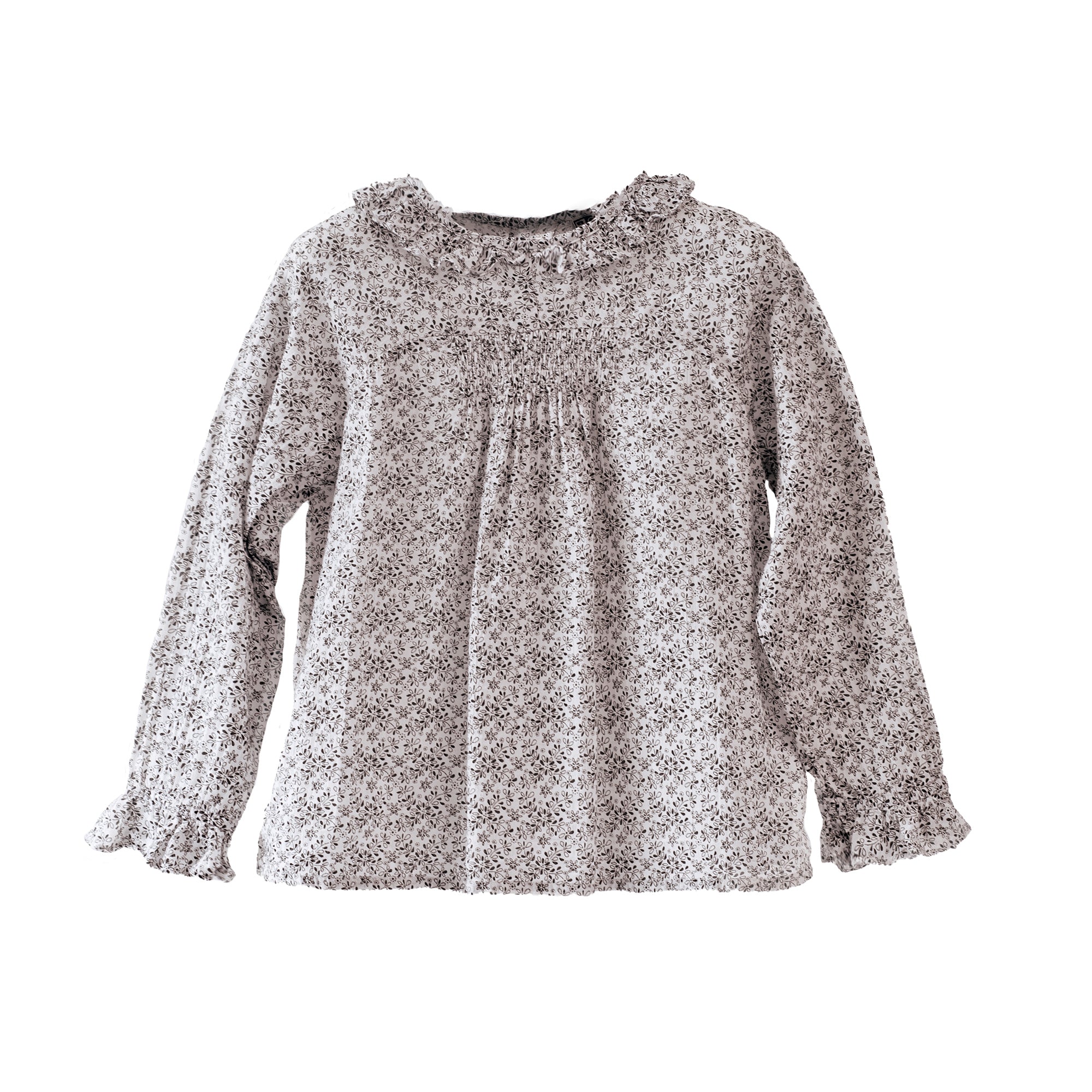 - Details : Liberty print, Wrinkled collar, Long raglan sleeves, Elastic cuffs, Pearly buttons, Gather, Light