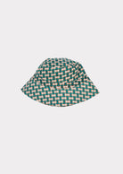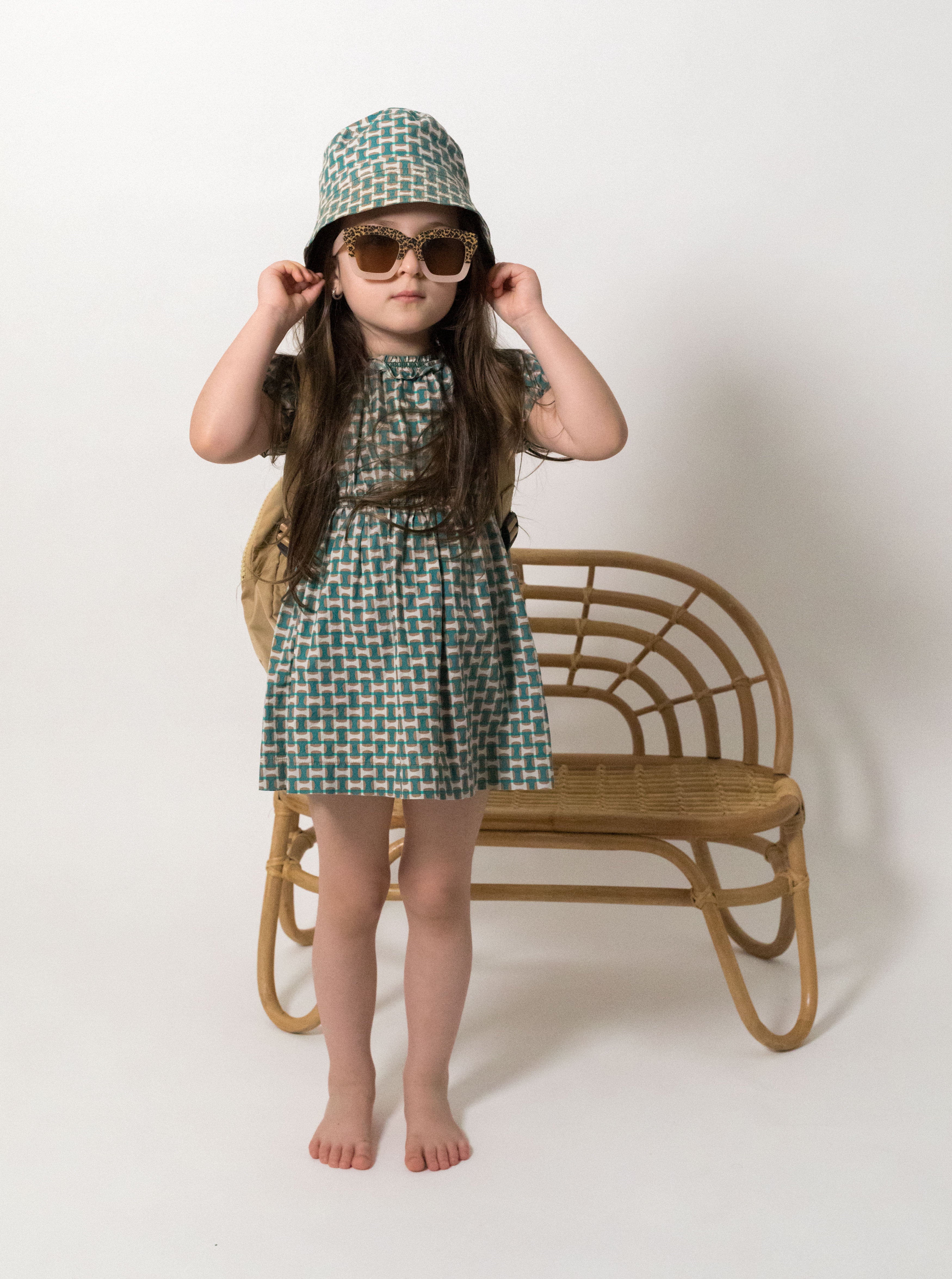 Wonderful dress from new Caramel Baby&Child collection in a smooth woven cotton printed with a bold green/brown/ivory retro print. Fastened with buttons in the back with string to make a bow. Pair it with the matching bucket hat!