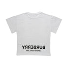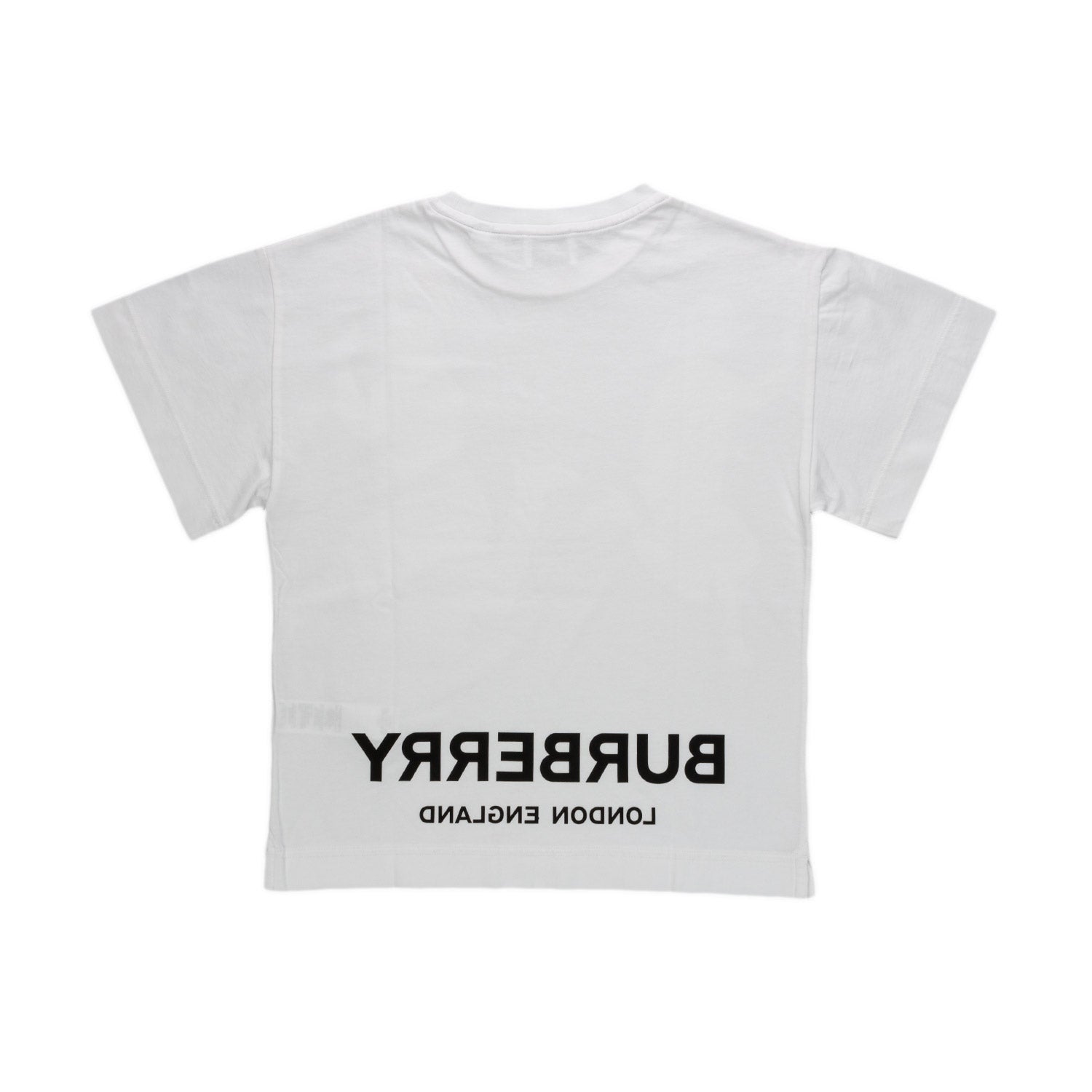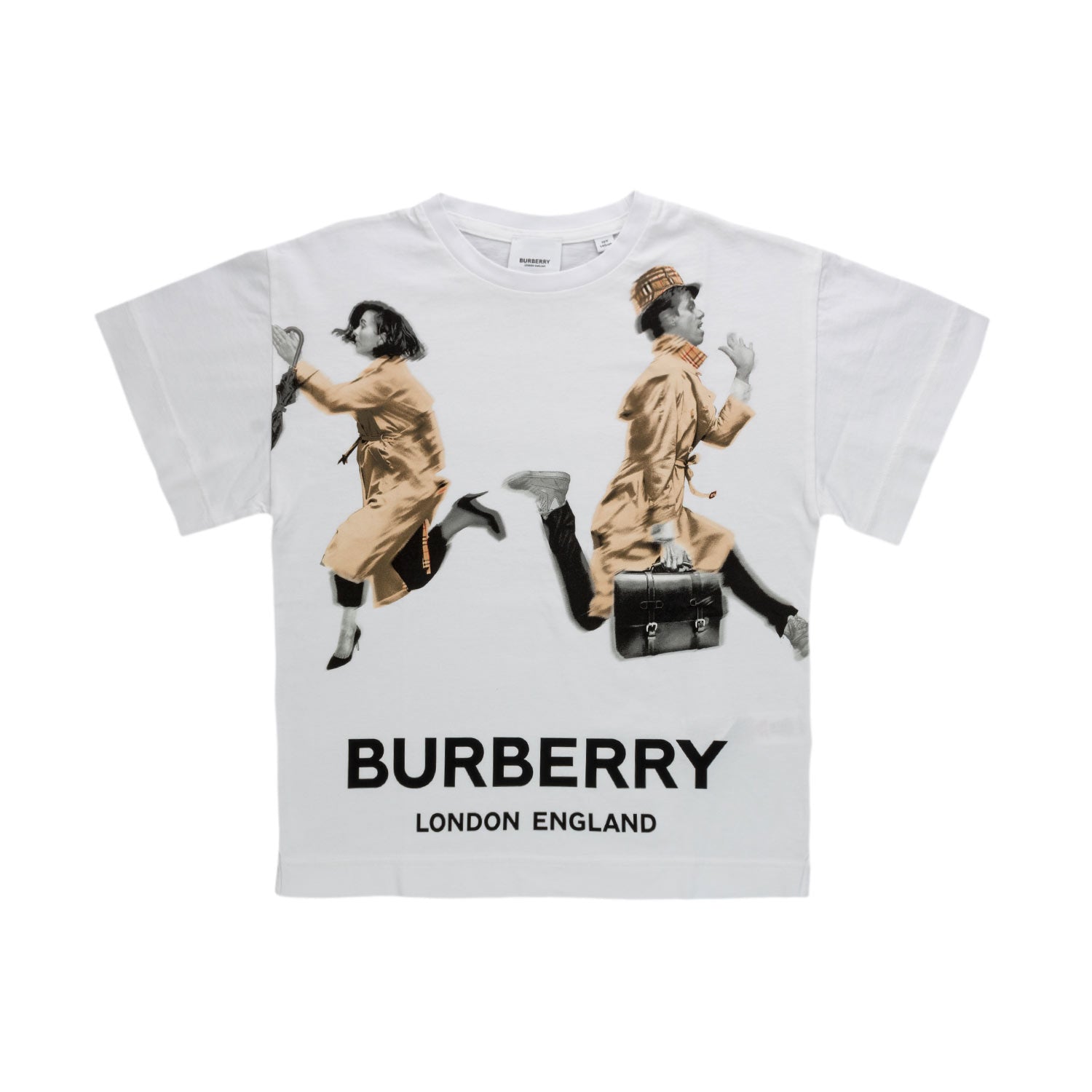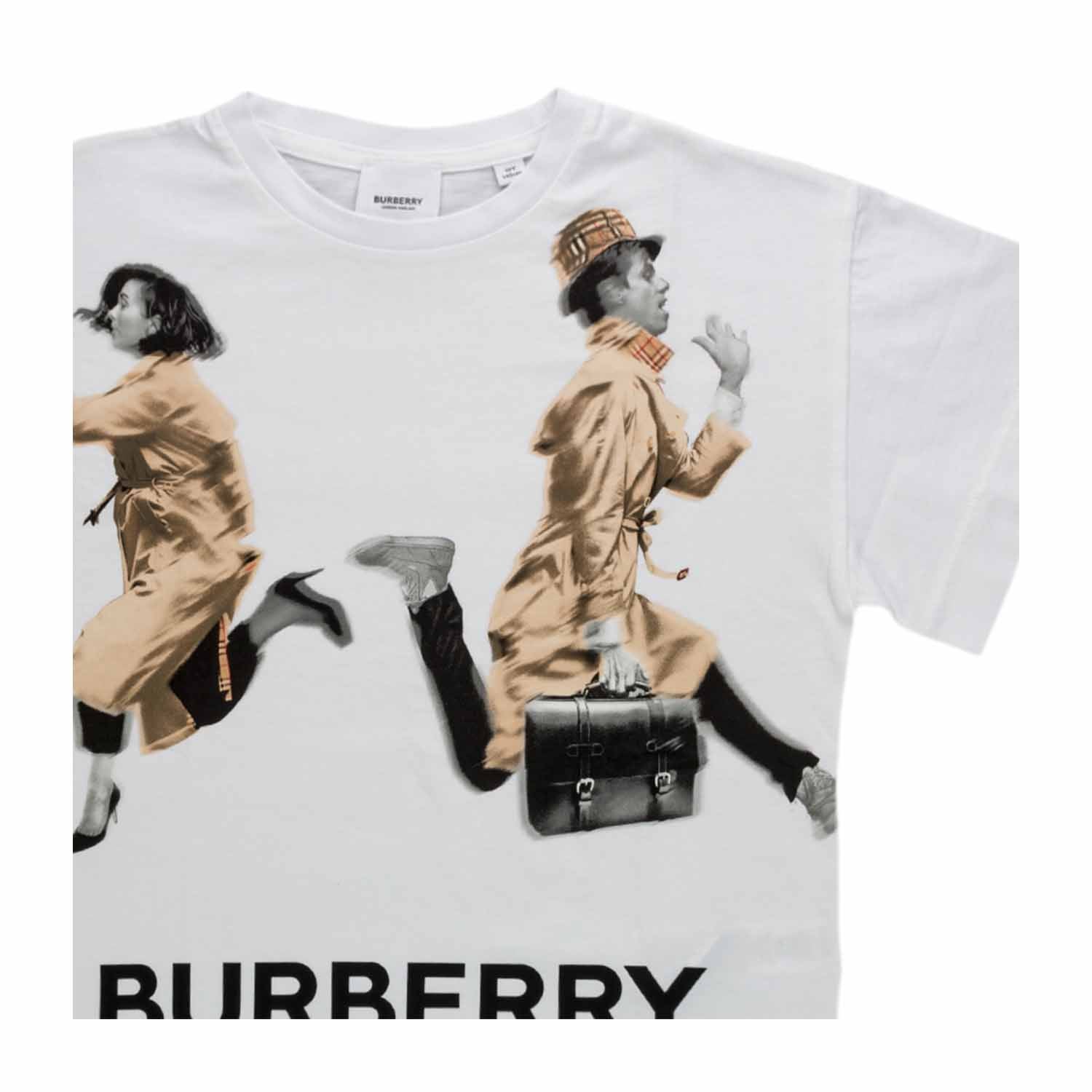 Iconic white cotton t-shirt with a photographic logo print on the front signed Burberry, from the new Fall Winter 19/20 Collection - Clothing line for girls. This beautiful t-shirt, from the A / W Girl and Teenager Collection, is made of soft cotton jersey, which guarantees maximum comfort and an excellent fit. It is characterized by a classic style with round neck, short sleeves and white surface, enhanced by the logo and photographic print of a man and a woman wearing an unmistakable trench coat.