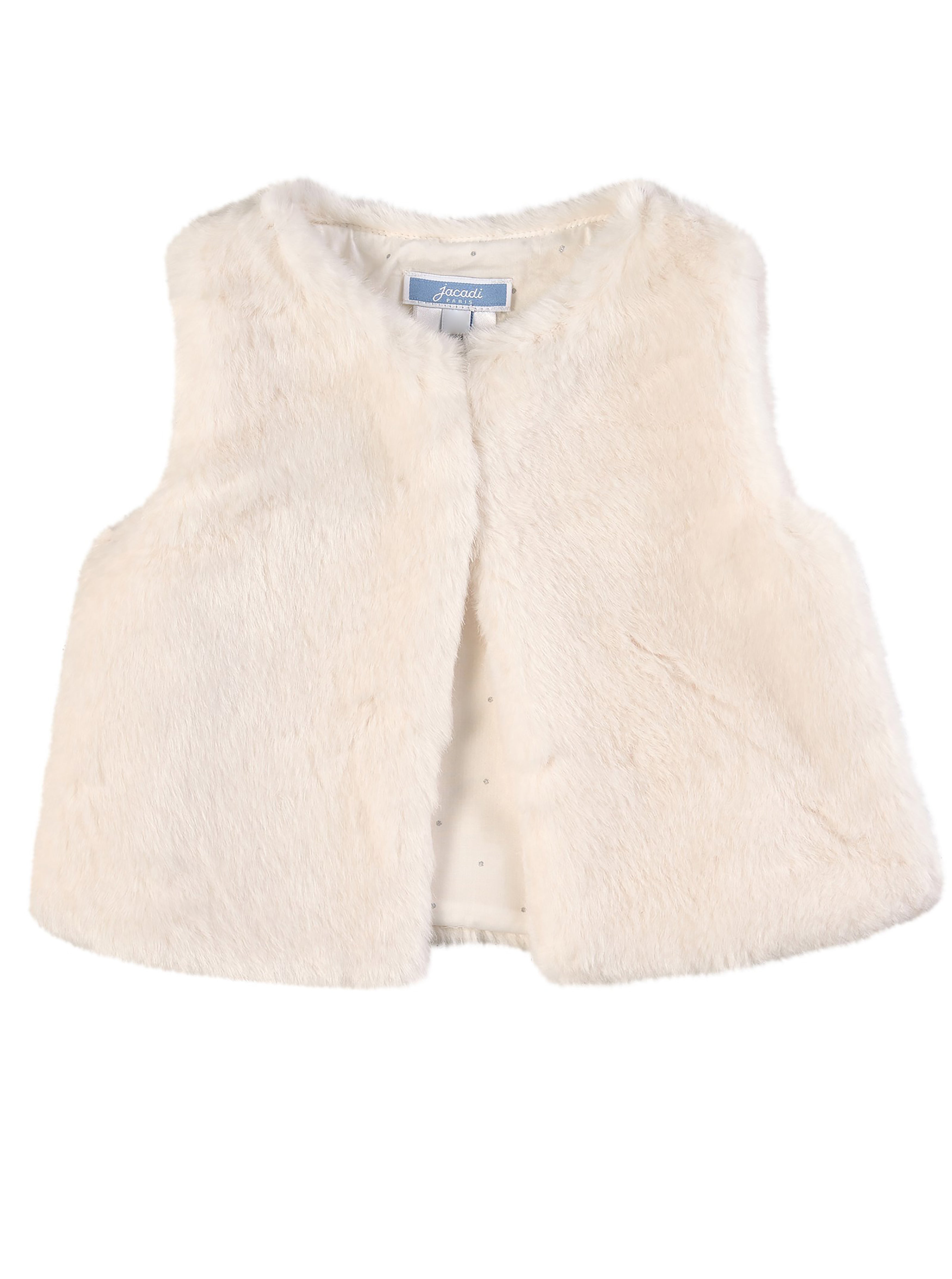 Cute white faux fur vest Jacadi vest with front tie. In our opinion it can be worn on both sides: one side polka dot and other faux fur