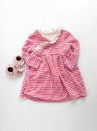 Ruffled collared soft fleece dress featuring pink and white stripes and elasticized waist.