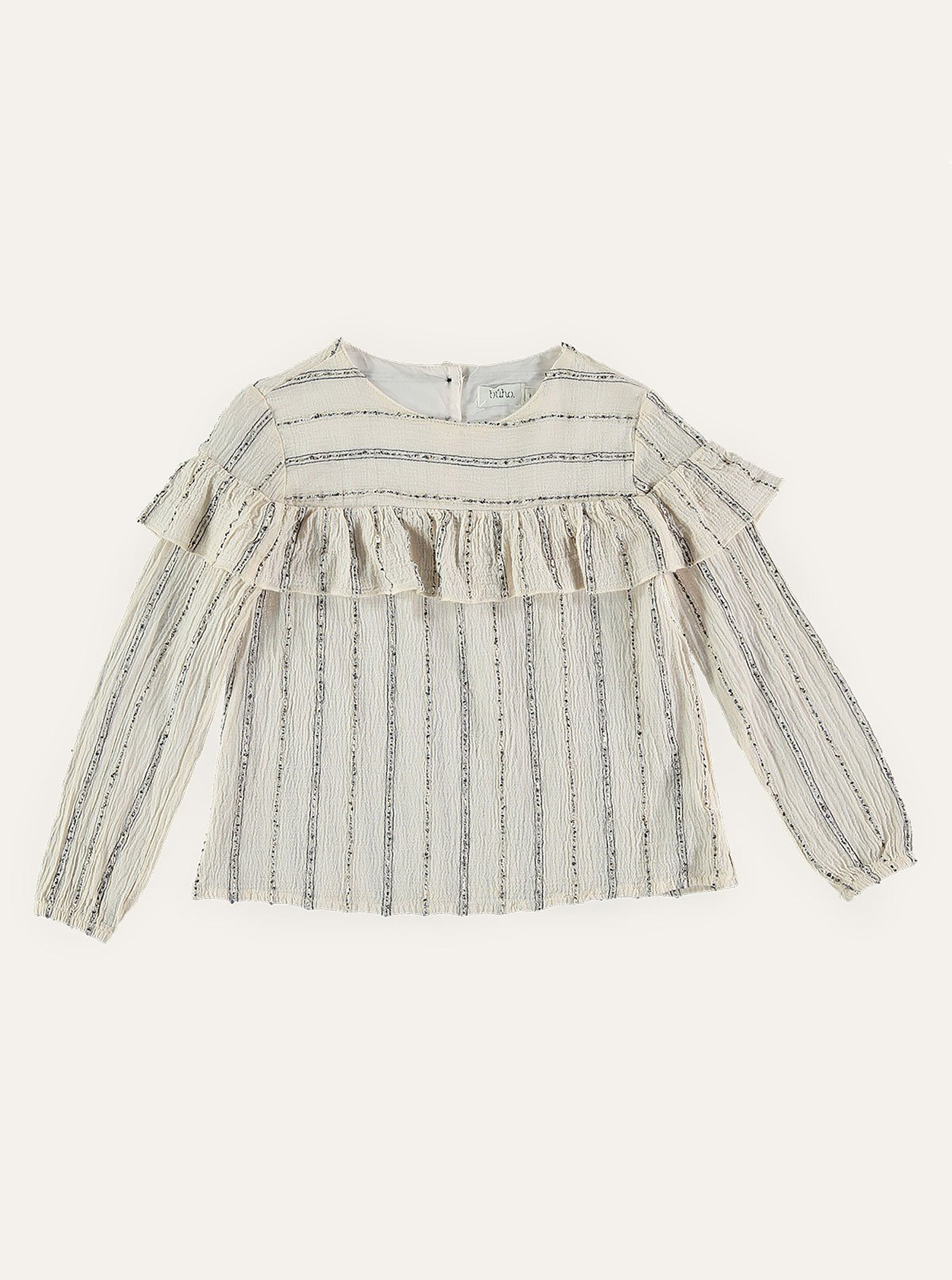 Please note we have the same blouse in two sizes: 3y & 6y A delicate and feminine Búho blouse, in a crinkle cotton gauze with lurex stripes. • Round neckline |