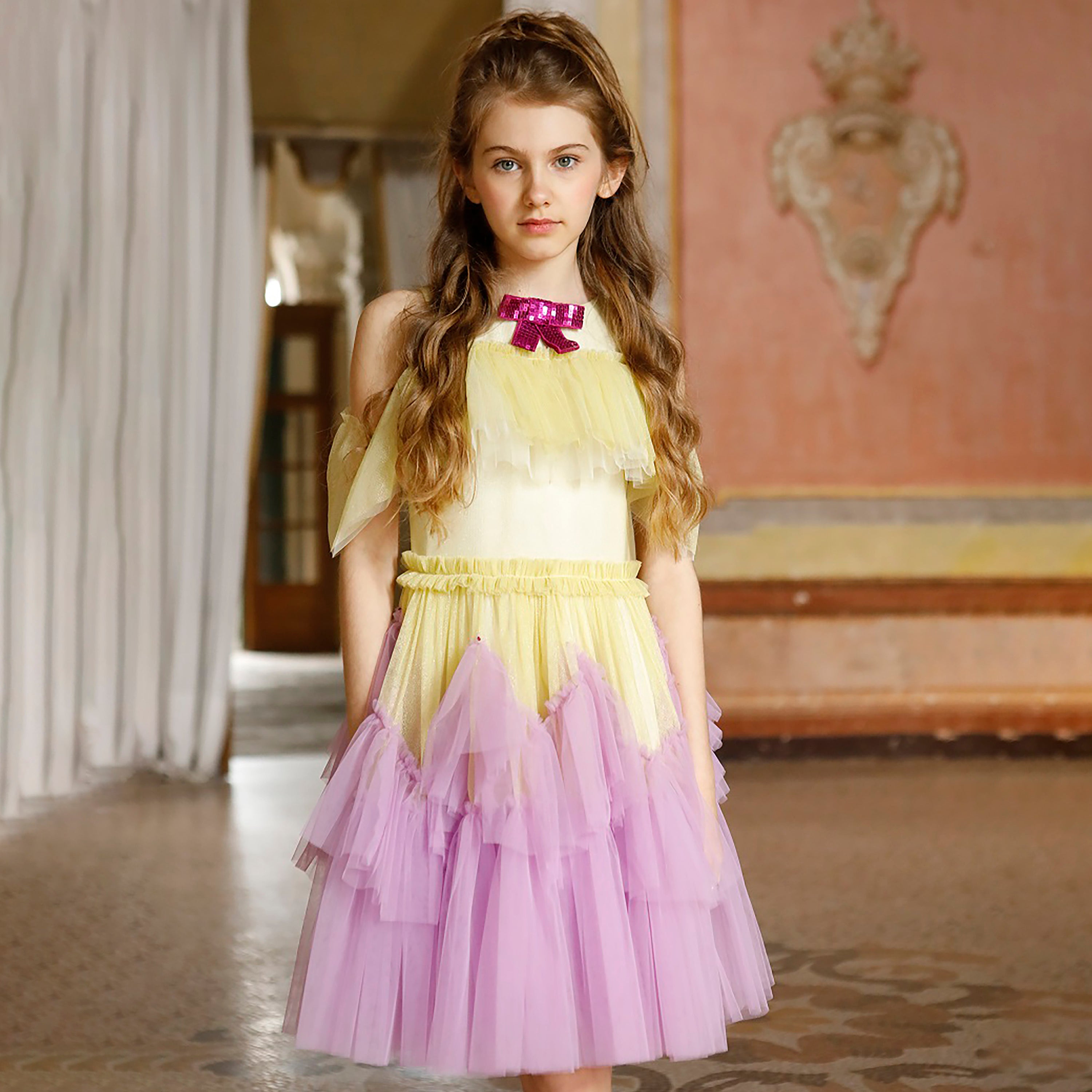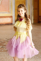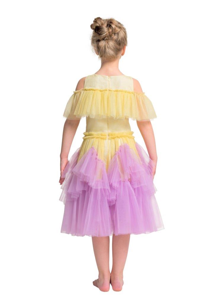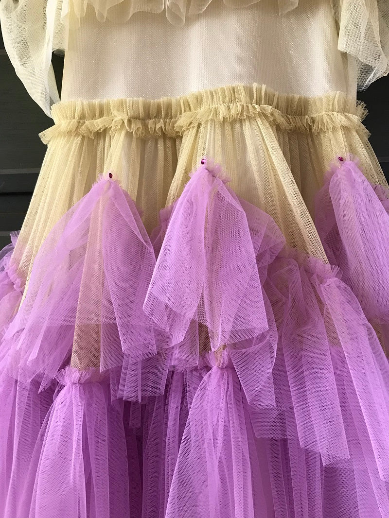 Beautiful dress in yellow tulle with golden lurex and lilac asymmetric frills. Decorated with Swarovski crystals on hem of some of tulle frills. Volume tulle frock is perfect for dancing, twirling, and having fun! The dress fastens with a concealed zip at the back. Fully lined with smooth silky lining.