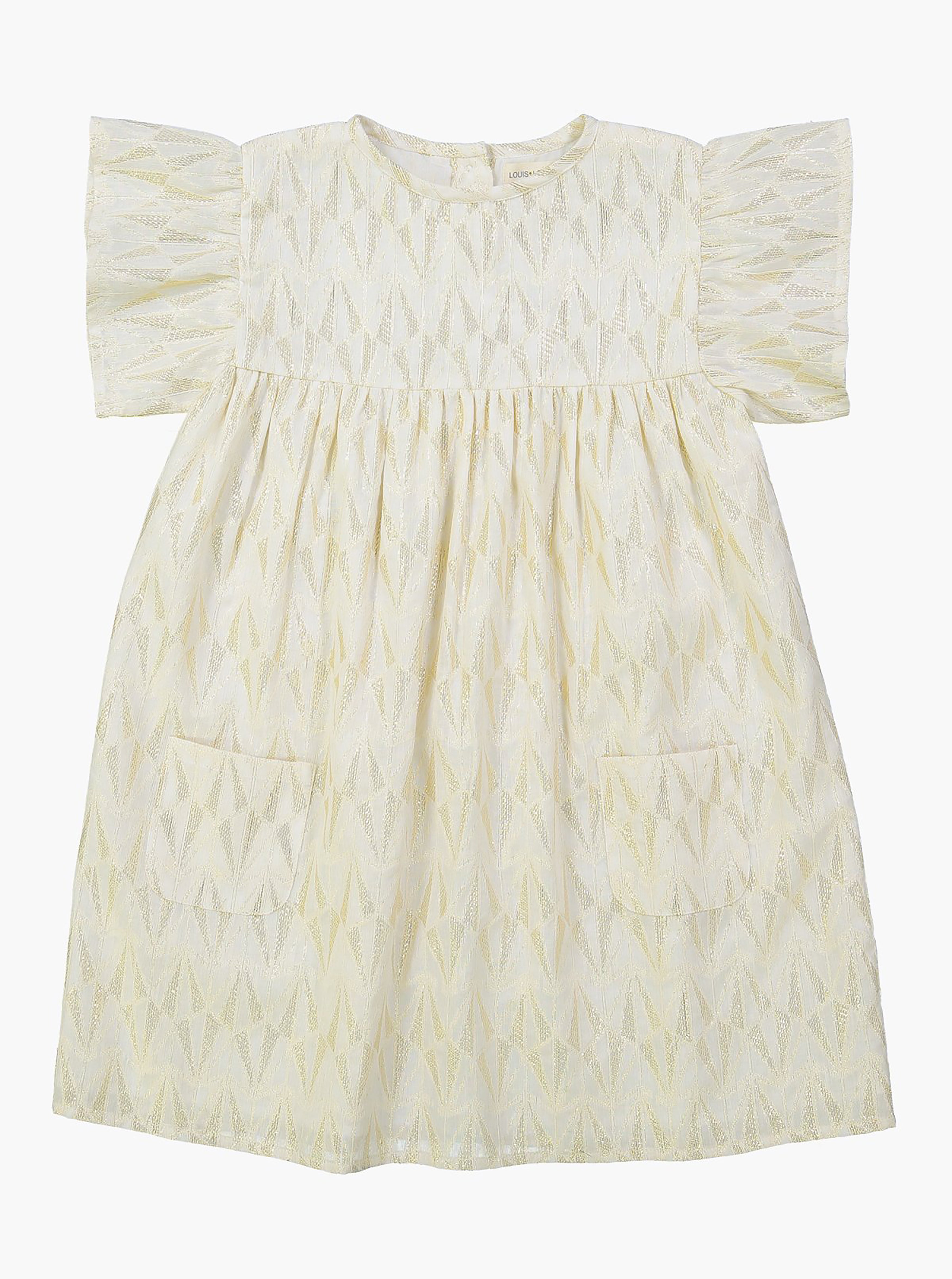 The Ava Triangle Baby Girl Dress by Louis Louise a whimsical short sleeve dress that will add some sparkle to any occasion. Features a gold lurex triangle pattern, two front pockets and buttons down the back. Made in 95% cotton, 5% lurex.