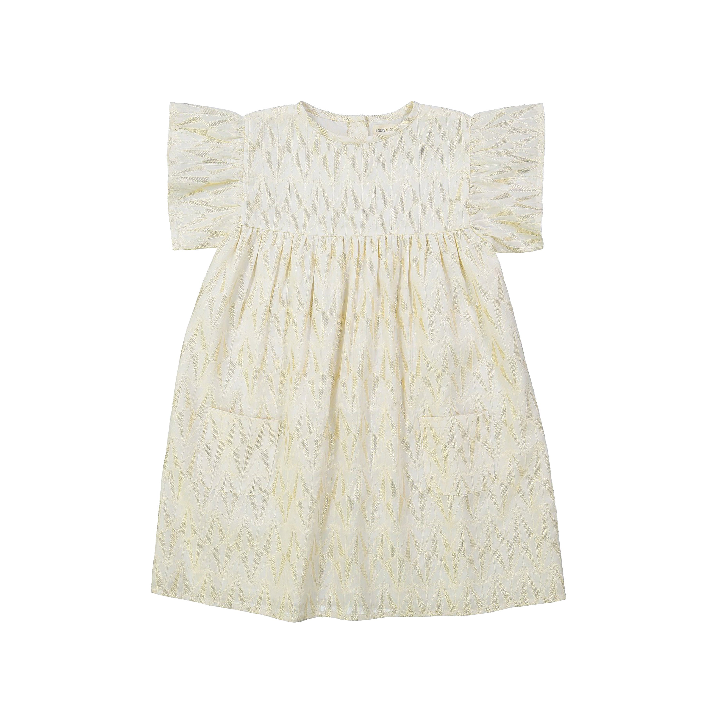 The Ava Triangle Baby Girl Dress by Louis Louise a whimsical short sleeve dress that will add some sparkle to any occasion. Features a gold lurex triangle pattern, two front pockets and buttons down the back. Made in 95% cotton, 5% lurex.