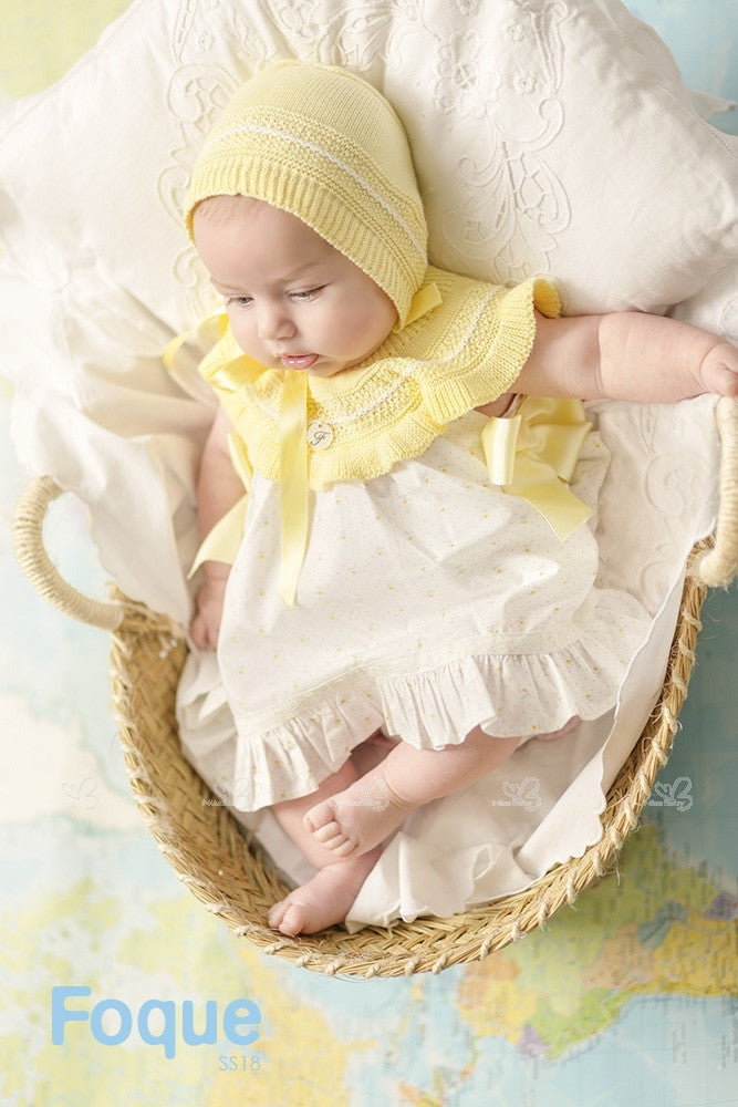 Lovely dress and bonnet set for little girls by Foque. The white broderie anglaise dress has a knitted yellow and white bodice and fastens with buttons and a yellow satin ribbon on one side. It has a matching yellow bow on the other side, a logo tab in the centre and a lace-trimmed voile lining. It comes with a matching bonnet trimmed with satin ribbon.