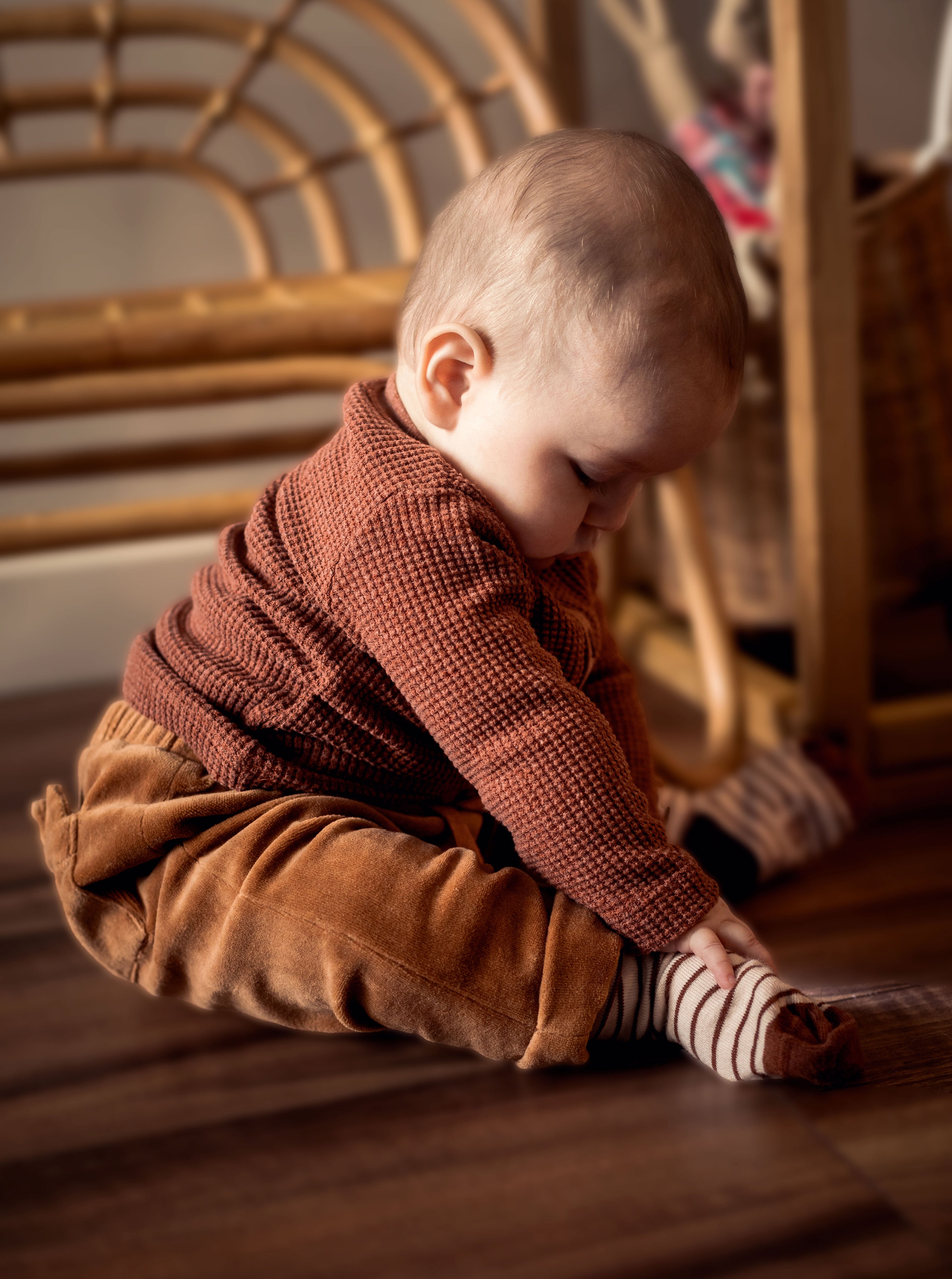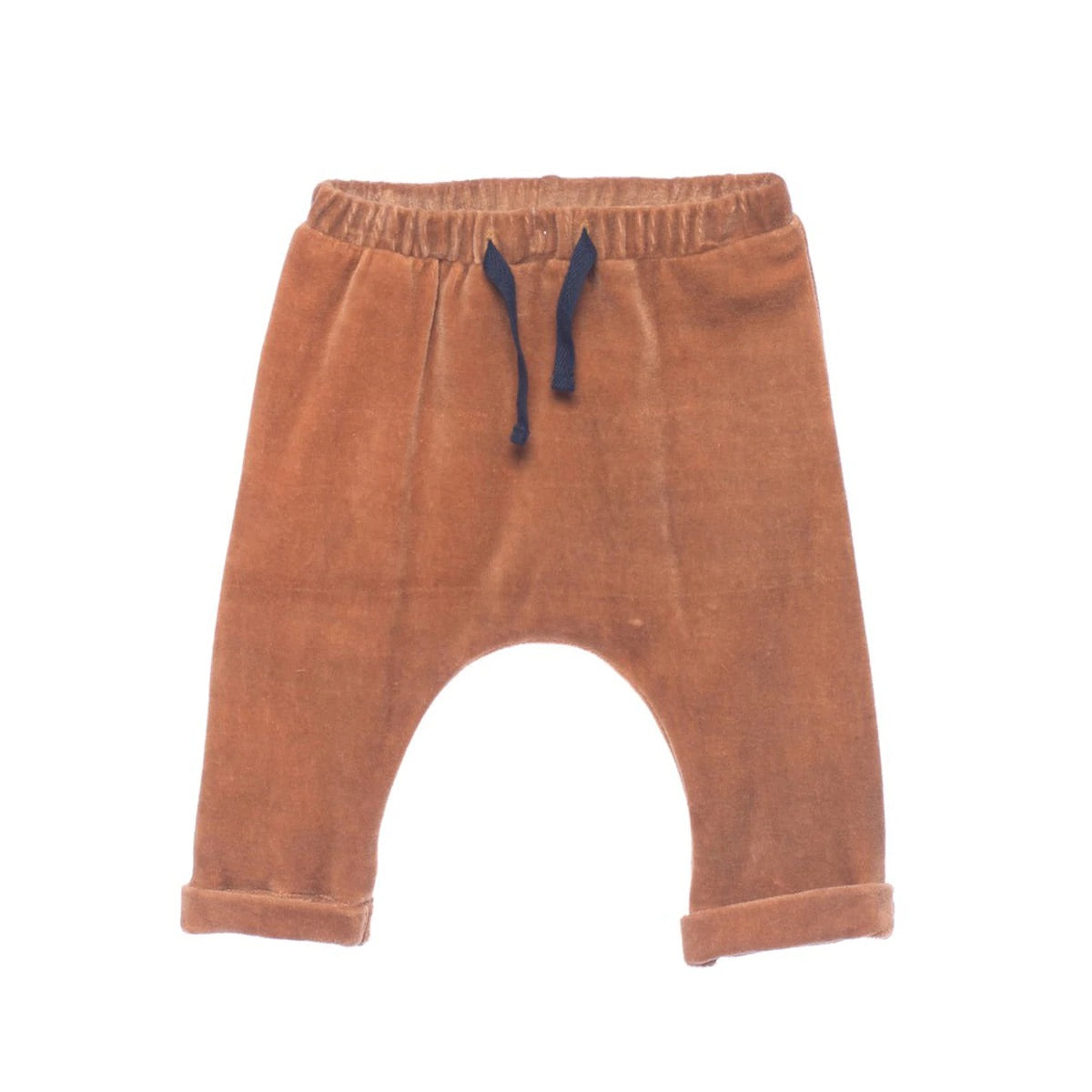 Luxe velour trousers for your little babe are a must for the season! Supremely soft, these trousers come in a rich caramel color and feature an elastic waistband and a cuffed hem.