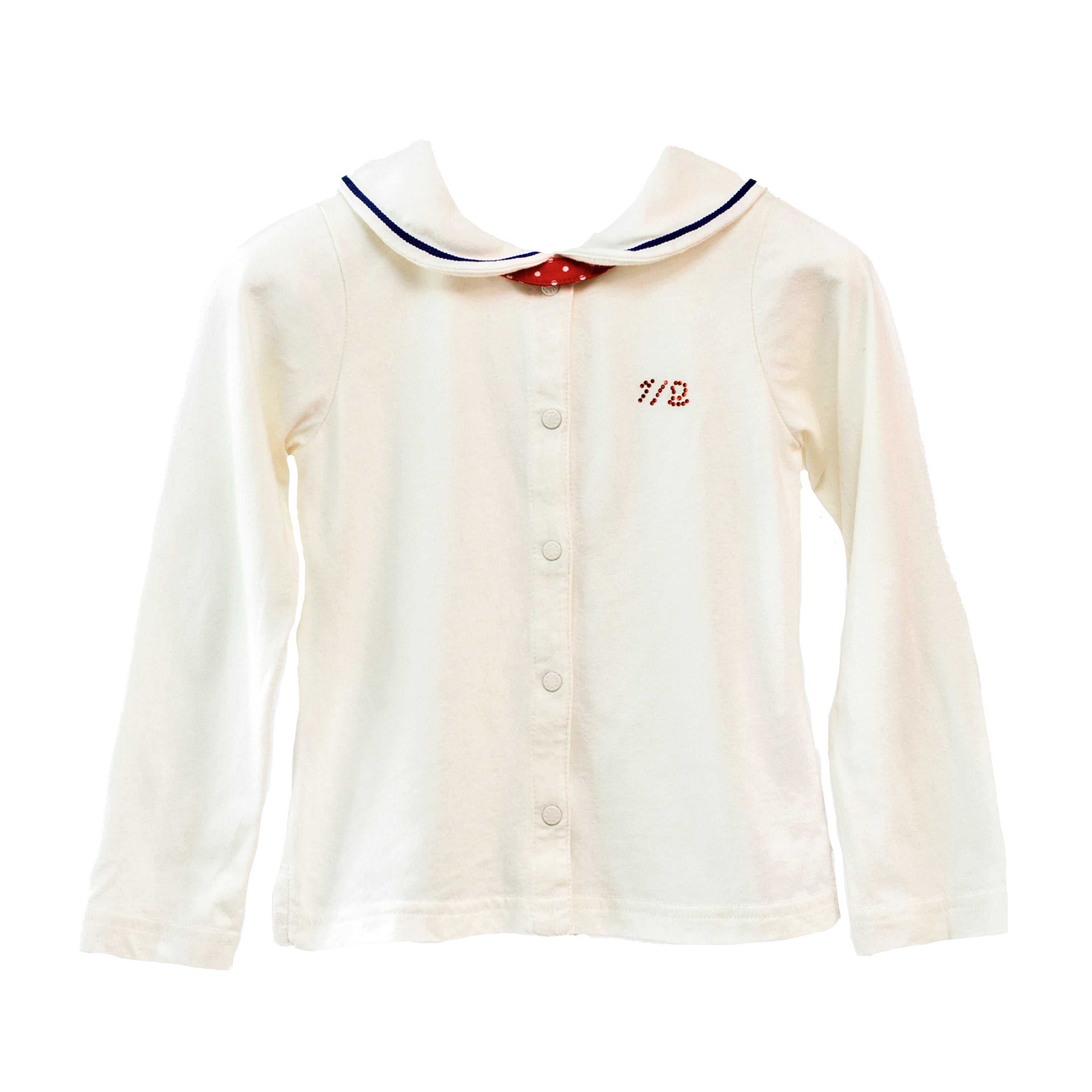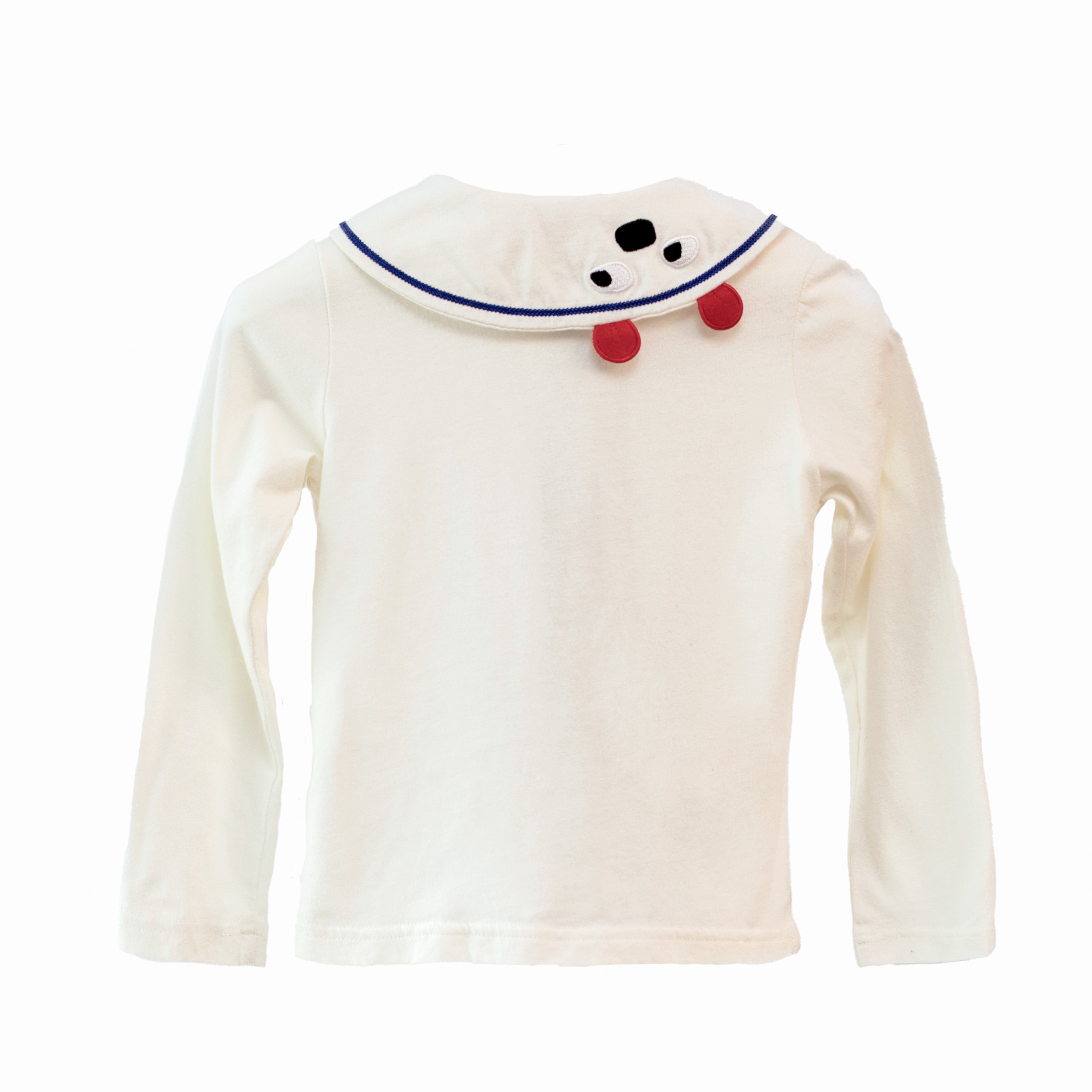 Long sleeve button down shirt with collar and removable scarf/bow in front. Collar features an animal motif on the back.