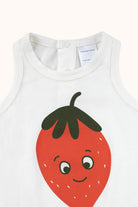 Strawberry Body for Baby / Off-white base / "Strawberry" print on the front in olive dark green and red / Sleeveless pattern / Round neckline / Half back opening with snaps at inseam for easy dressing and diapering. The main composition is pima cotton to make it more durable and to provide maximum comfort to the lucky one who wears it. Made in Portugal.