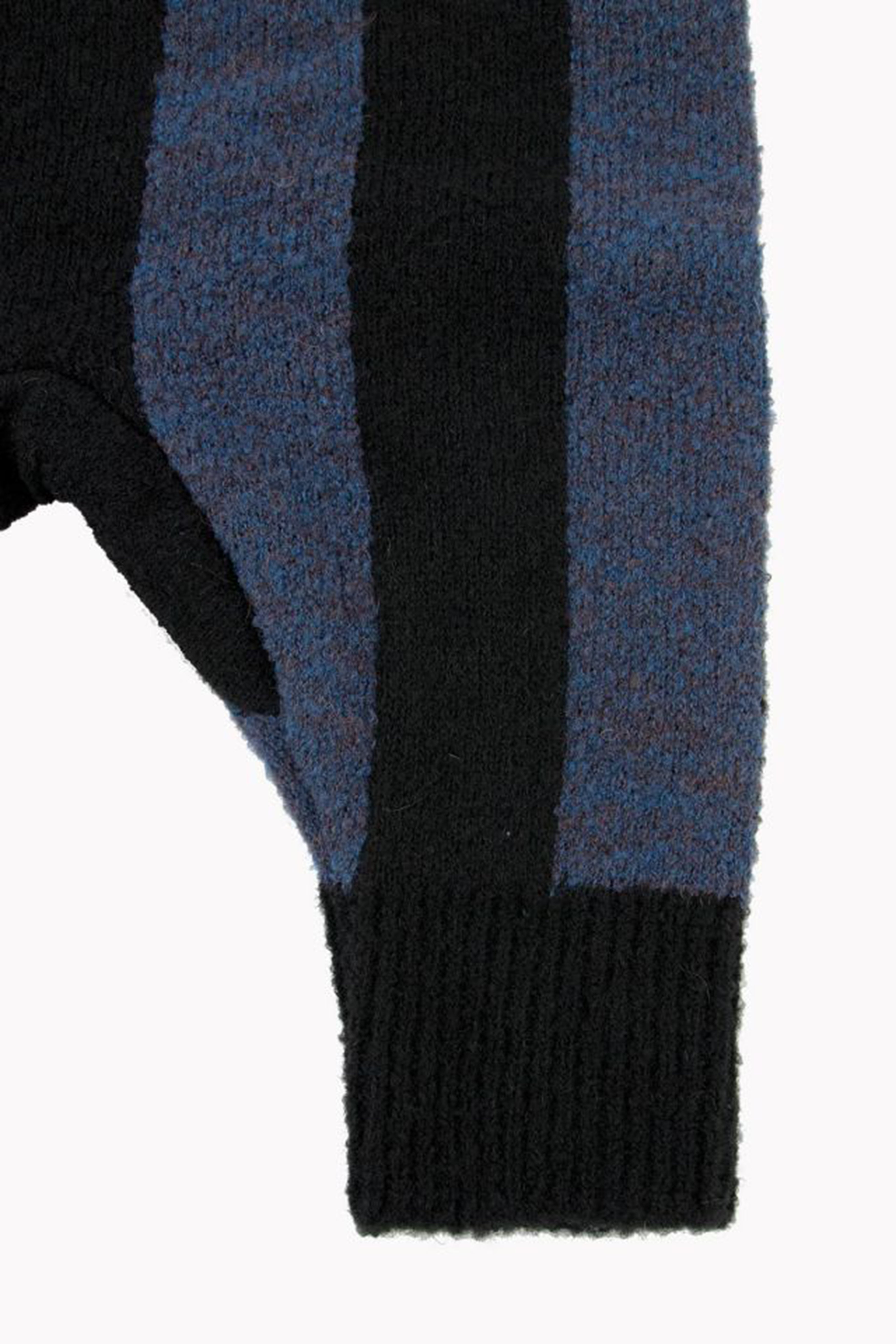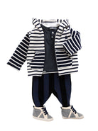 The Stripes Pant is a long pant for baby and toddler. It comes with a small "Tiny" embroidery on the top. The pant's base colour is black and true navy vertical stripes base in fluffy yarn. The waistband is cozy elasticized. It also brings black rib trims.