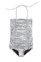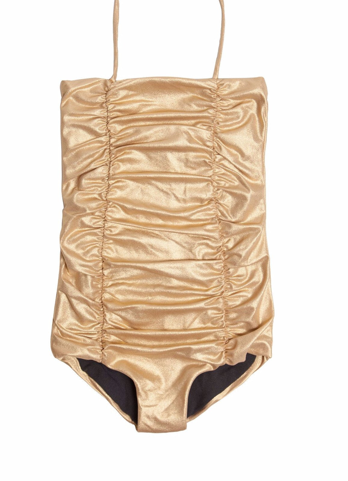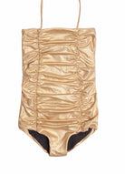 A beautiful and elegant halter top style bathing suit featuring a gold or silver metallic gathered base.