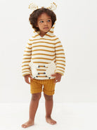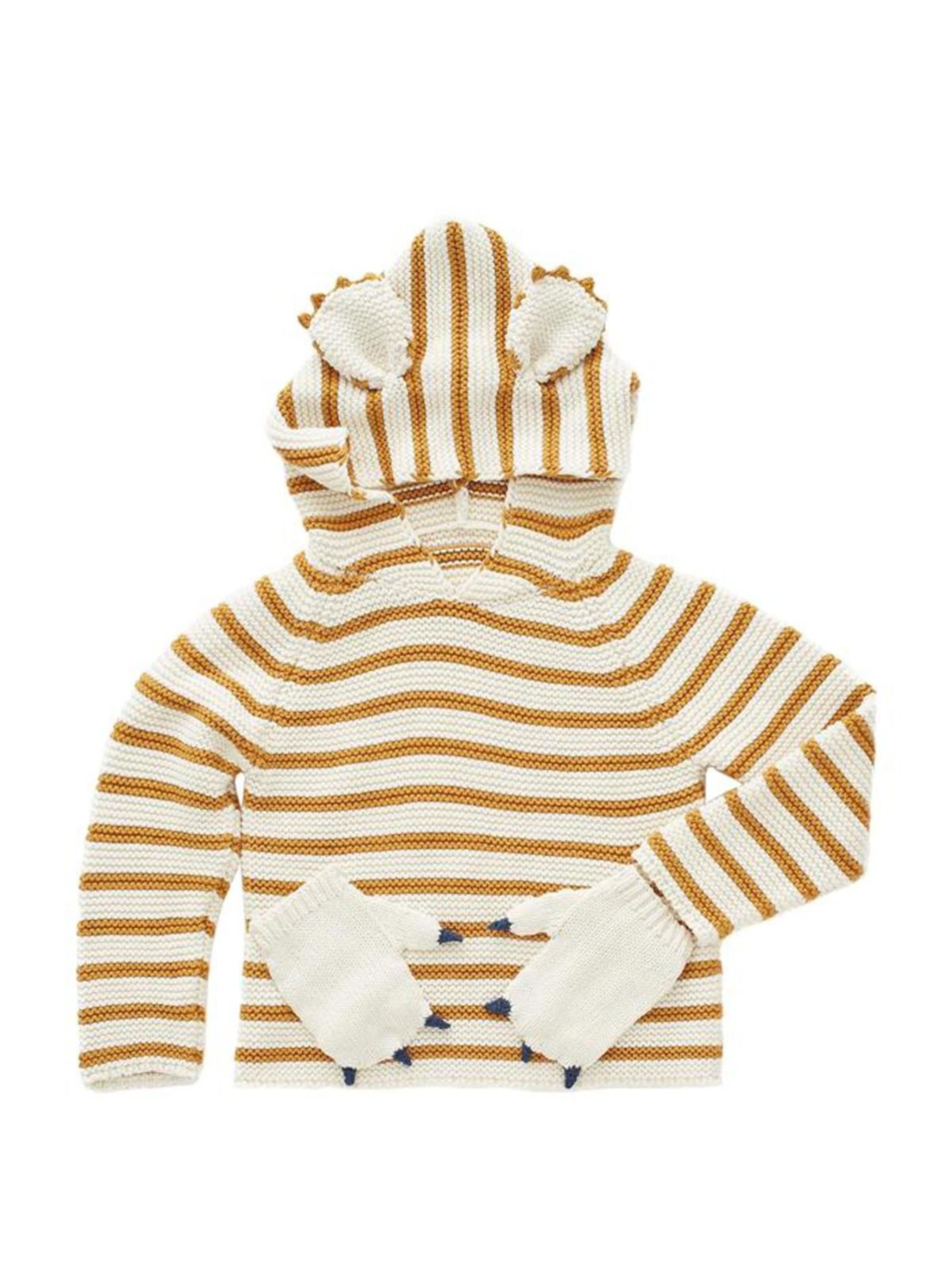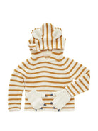 The Oeuf Koala Hoodie in Ochre and White is a cute hoodie with ears on the hood and little front pockets shaped like koala paws with an all over stripe. Colour: Ocre and White