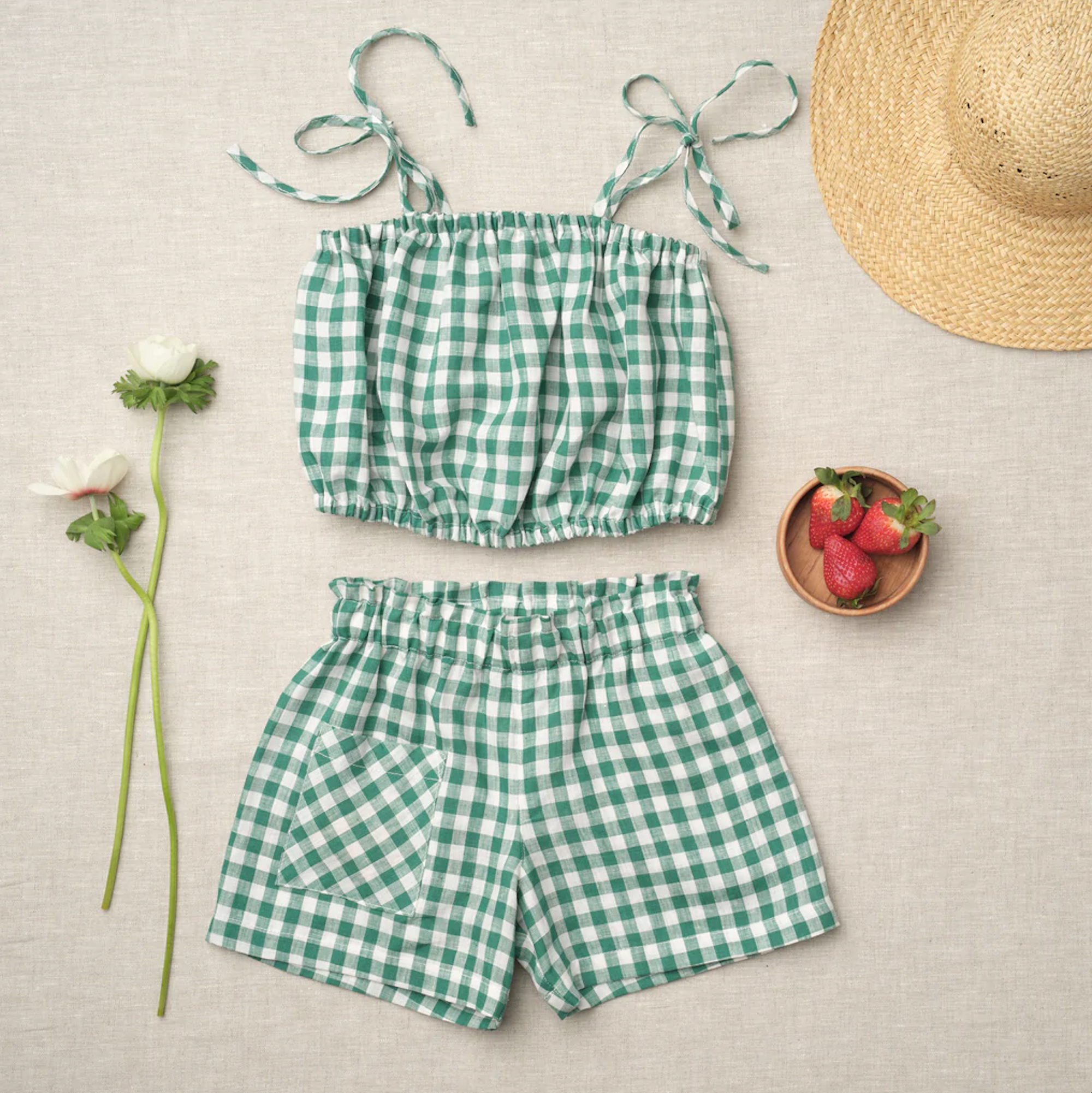 This is PV's new bubble top in a beautiful linen gingham from Japan. This top has a cute bubble shape, gentle elastic around the top and bottom, and adjustable ties so it will grow with your child over many seasons. Pairs perfectly with our corresponding flutter shorts, prairie skirt, and linen shorts and pants for a very sweet summer look.