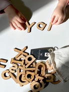 Let children explore letterforms and practice their alphabet through play with GLADFOLK full wooden alphabet set in beautiful maple wood! Full alphabet set features uppercase A-Z and lowercase a-z, for a full 52-piece set that comes in a lovely cloth drawstring bag for safekeeping & storage.
